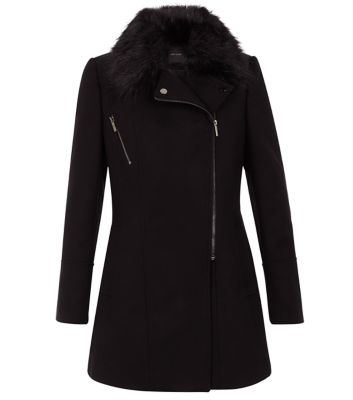 This black longline biker coat is a wardrobe classic for the colder seasons.- Faux fur collar- Zip front fastening- Longline design- Simple long sleeves- Casual fit- Pocket front- Model is 5â8â/176cm and wears UK 10/EU 38/US 6