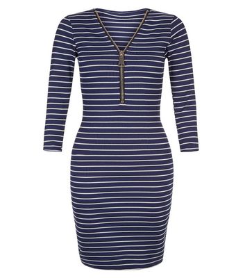 Blue Vanilla. Bring stripes into laid back styles with this blue stripe zip front dress. Pair with block heel ankle boots for a casual finish.- All over stripe print- Zip front detail- V-neckline- 3/4 sleeves- Slim fit that is closely cut- Mini length- Model is 5â8â/176cm and wears UK 10/EU 38/US 6