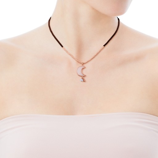 Collar Lune Chérie - Eugenia by TOUS de vermeil rosa y cordón marrón con cuarzo rosa y calcedonia. Largo: 42cm. Vermeil: Plata de primera ley cubierta por un baño de oro rosa de 18Kt.