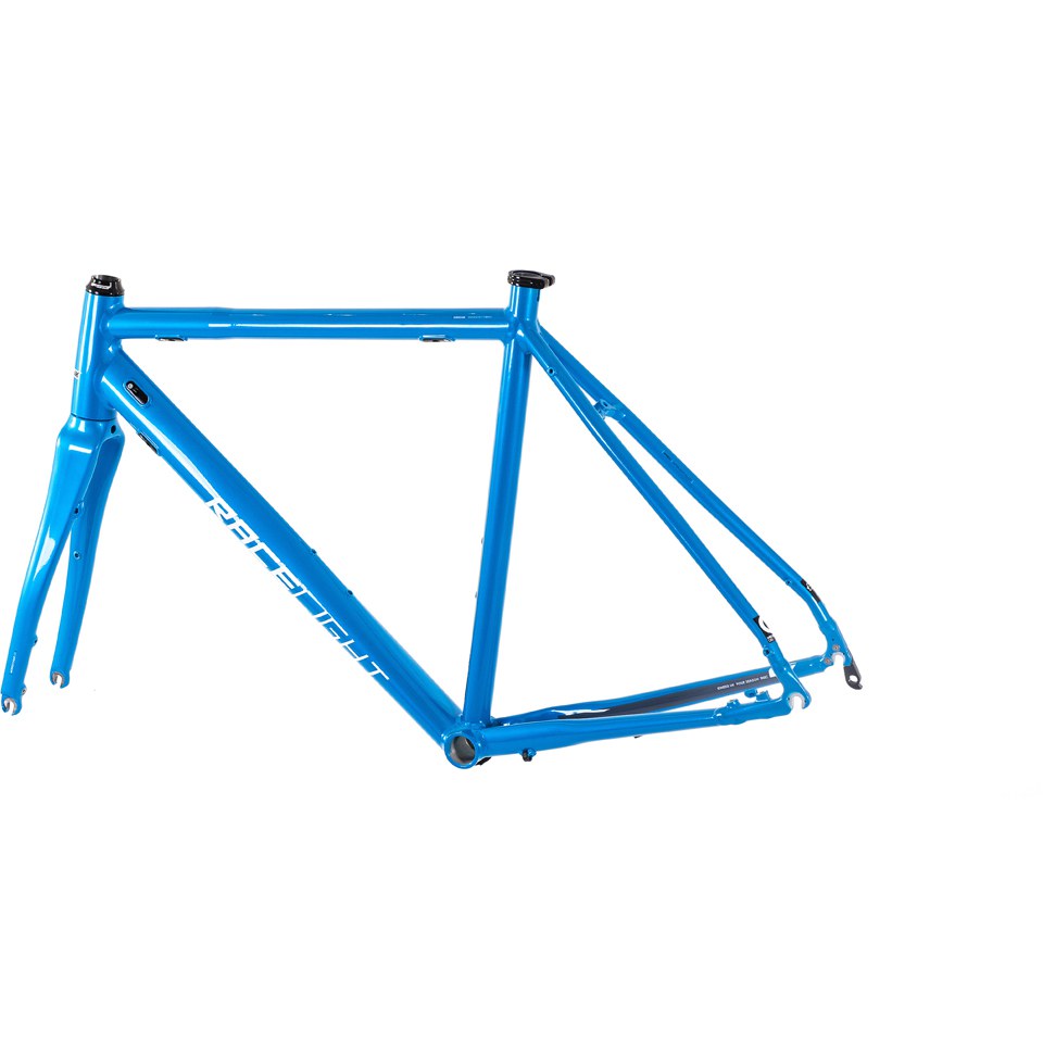 The Racelight 4S Disc Frameset. For 2015 the ultimate Winter bike gets the ultimate upgrade with the addition of disc brake mounts, internal cable routing and a brand new carbon fork to match. Disc brakes really come into their own on the grimy wet roads that this winter bike has to endure, and coupled with up to a 32mm tyre and full mudguards it makes life a little easier for the rider too! The inboard disc caliper mount is the new Shimano flat mount standard and is very minimal. This frame has been designed to be built with either disc or caliper brakes so you can use current non disc wheels and caliper brakes and upgrade to disc later…or run caliper brakes in the Summer and discs in the Winter maybe…it’s down to you.The dropouts are adaptable between 130mm QR and 135mm QR by means of our Kinesis dropout adaptors, keeping all options open.The new full Carbon fork is specially designed for this model to run either disc or caliper brakes and features the discreet flat mount with hose clip, eyelets for mudguards and a caliper brake mount in the crown. The tapered steerer provides plenty of stiffness to cope with the disc brake forces and keeps everything tracking and handling as nicely as before.The frame is made from smooth welded Kinesium and features internal routing for the rear caliper brake cable [if required]. It also has full internal routing for the front and rear mech cables and rear disc brake hose in the downtube, which neatly exit via ports in a special BB shell. By the way, that BB is BSA threaded 68mm – phew. No creaky press fit BB. The Kinesium tubing is butted and shaped to give a stiff front triangle with more compliance in the rear triangle provided by the skinny curved stays, giving a balance of performance and comfort we’ve tuned over a decade or so. All at a very low weight too.We have also added provision for Di2 wiring, which if combined with a hydraulic brake set up really would be a low maintenance wet weather bike.There is also a new 55.5cm size added in the range this Autumn.This brings the 4S right up to date and we believe it is the best value and most versatile four season bike on the market. The 4S disc is in a class of its own. Features: Smooth welded Kinesium tubeset is optimised for stiffness in the front triangle with compliance for comfort in the rear triangle Tapered headtube with integrated FSA type headset Disc mount – Inboard Shimano Flat-mount on frame with post mount adapter included. Rotor size is 160mm with post mount adaptor. Flat mount calipers can be run with 140mm rotors or 160mm with appropriate adaptor. Eyeletted seat stays for mudguards and racks, double bottle cage mounts. Inboard caliper is out of the way making rack and guard mounting simple. 32mm tyre clearance with 'guards. Colour matched full carbon fork with flat mount, eyelets and long drop brake caliper mount Internal cable routing, Di2 compatible 130mm and 135mm rear QR hub compatible – removable bolt in dropout spacers Dual bottle mounts FSA Taper headset, Kinesis seat clamp, 160mm flat mount to post mount adapter included. Tapered headtube – 1” 1/8 top race, tapered to 1” ½ bottom 36x45 integrated FSA type. 27.2mm seat post required 68mm BSA threaded bottom bracket – it works! 31.8 band on front mech mount Di2 Ready Internal hose routing in downtube Replaceable rear mech hanger Frameset includes fork, headset, seatclamp and two 160mm post mount adaptors Sizing Centre /top, 48cm , 51cm, 54cm , 55.5cm , 57cm, 60cm , 63cmColours: Cyan Metallic Blue or Steel Silver