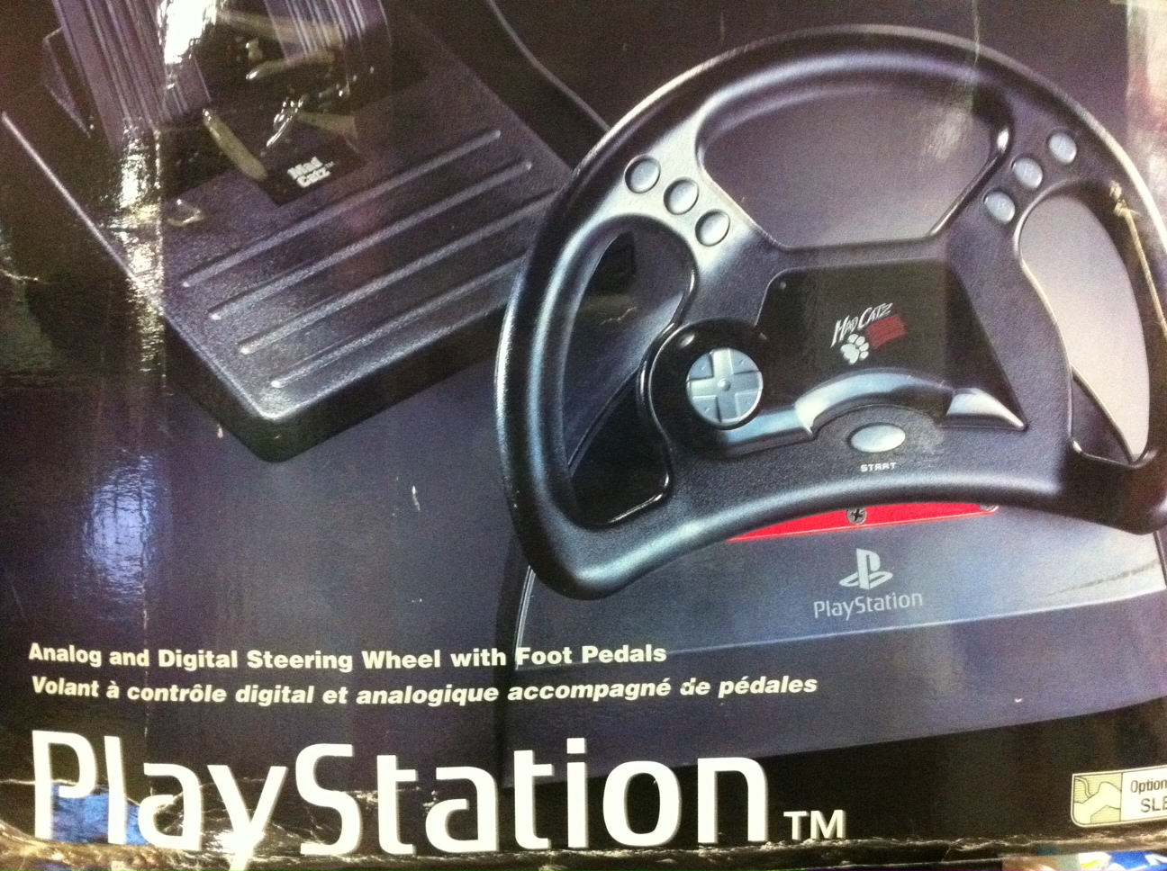 Volante analogico y digital con pedales y palanca de cambios. Pad direccional fronta, pausa, botones frontales de PSX. Botón R y L traseros. Se puede ajusta verticalmente el angulo.