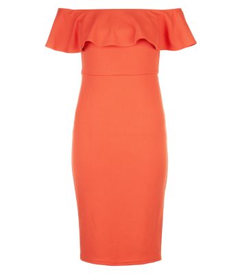 Red Textured Frill Bardot Neck Midi Dress