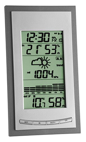 TFA 35.1078.10.IT, AA, Gris, Plata, 100 x 35 x 180 mm. Transmisión de la temperatura exterior y la humedad a través de hasta 3 transmisores. Indicación de la temperatura interior y la humedad. Función de máxima - mínima. Pronóstico del tiempo, la tendencia de la presión atmosférica. Presión atmosférica con indicación gráfica de barras de las últimas 24 horas